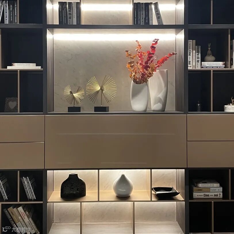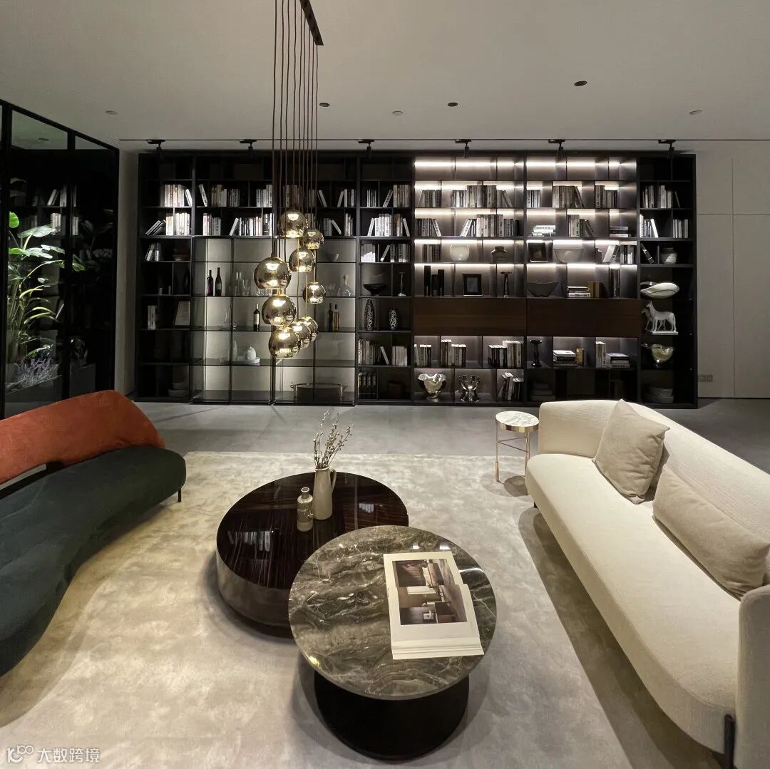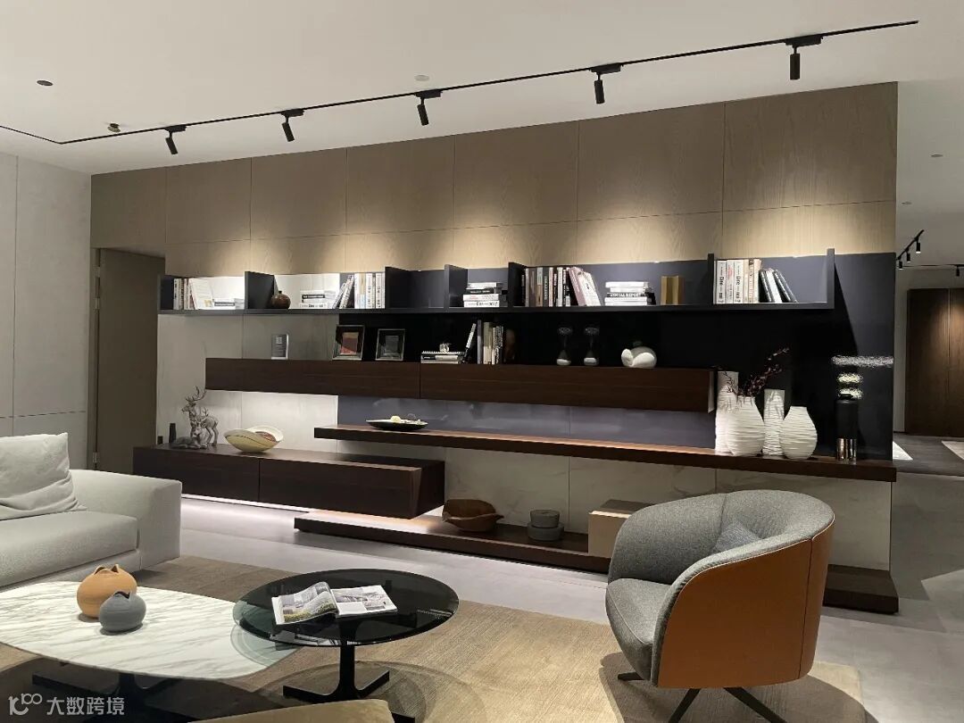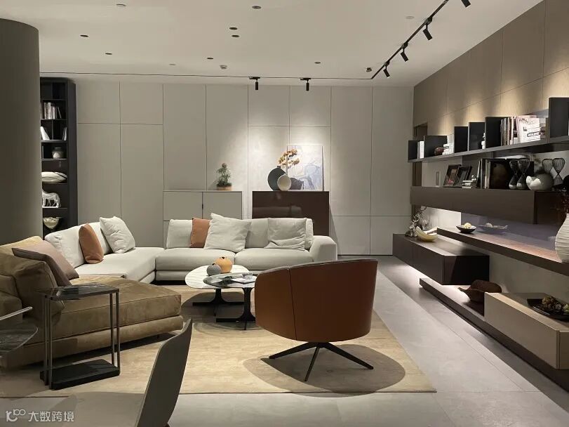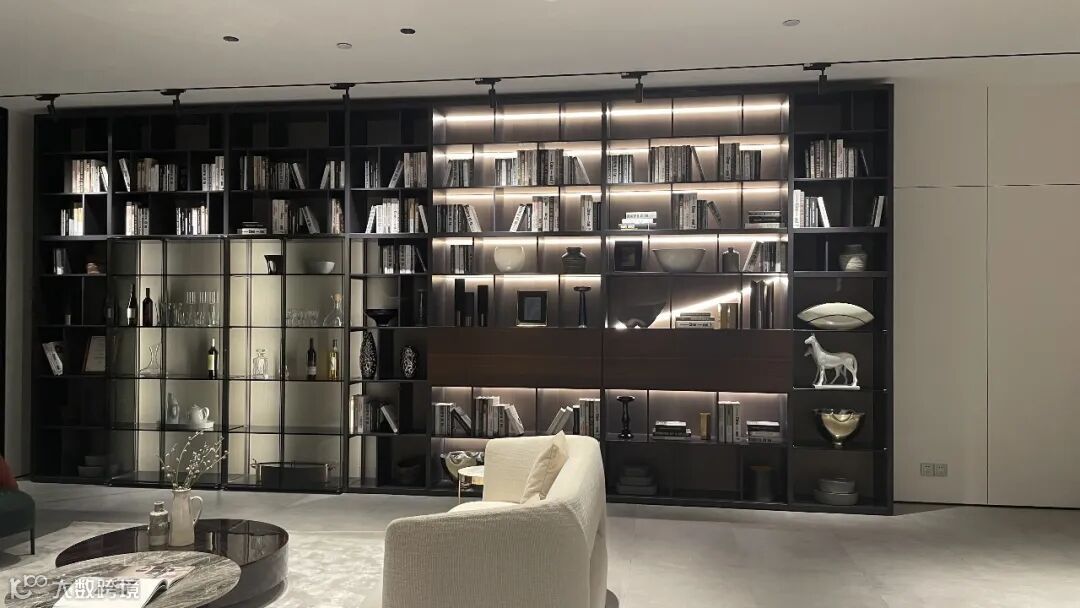 走过餐厅即来到第一个会客区,首先映入眼帘的是Crossing墙体系统,错落别致的交替层架、优雅通透的玻璃柜门、多种开合方式的柜体模块组合在一起,呈现出震撼多变的视觉效果。在纯净的空间基底里,色彩、线条与展品跟随光感流动,打造出优雅华贵的视觉盛宴。