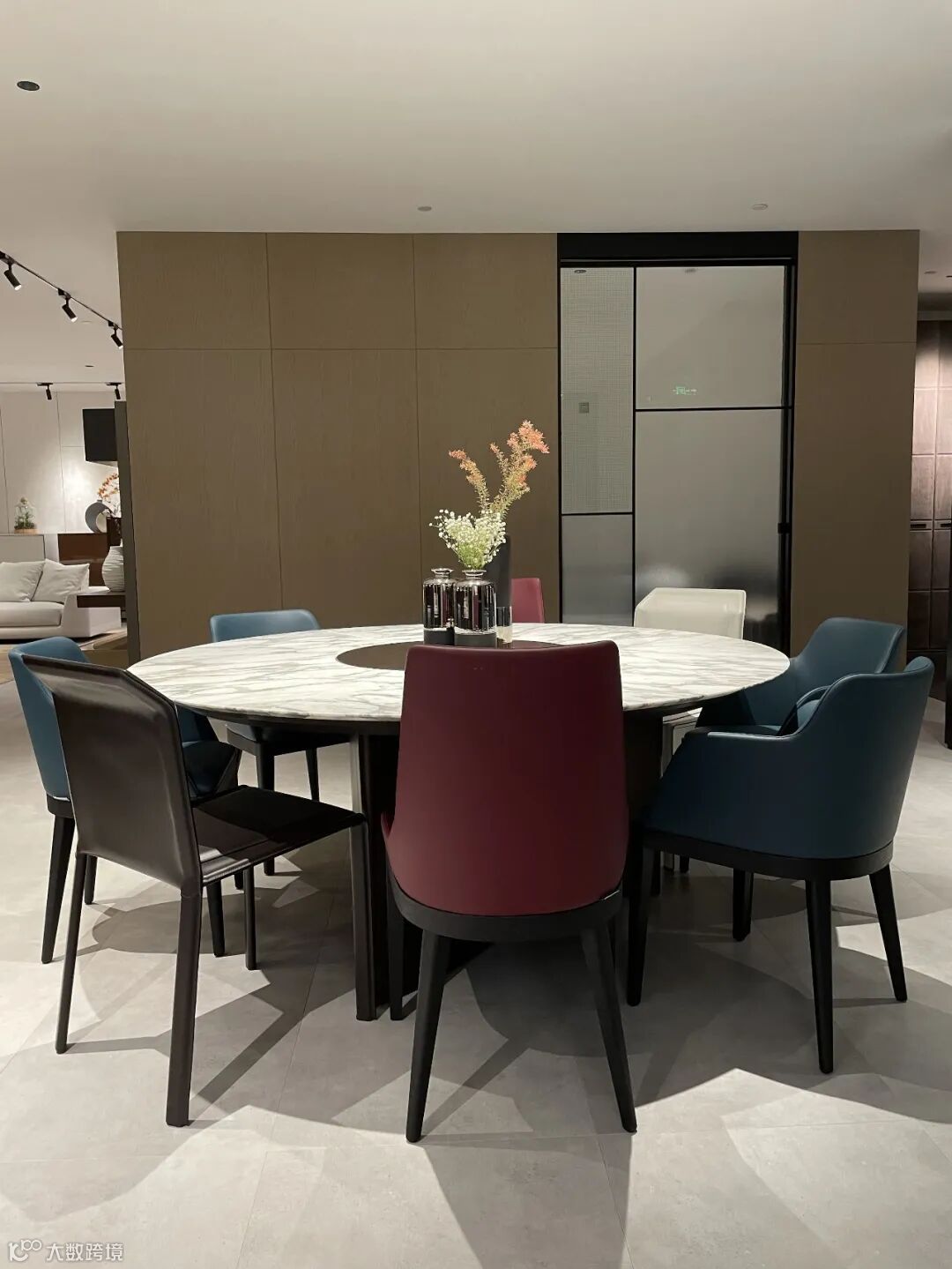 从会客区右转,便进入第二套餐厅区域。Ala系列圆形大理石餐桌颇具中式风格,白色大理石绵延的纹理如山峦雾起的山水画般空灵雅致,搭配红蓝撞色的Cleo餐椅,和棕白两色的Brera餐椅,为用餐空间增添了几抹生动的意趣。