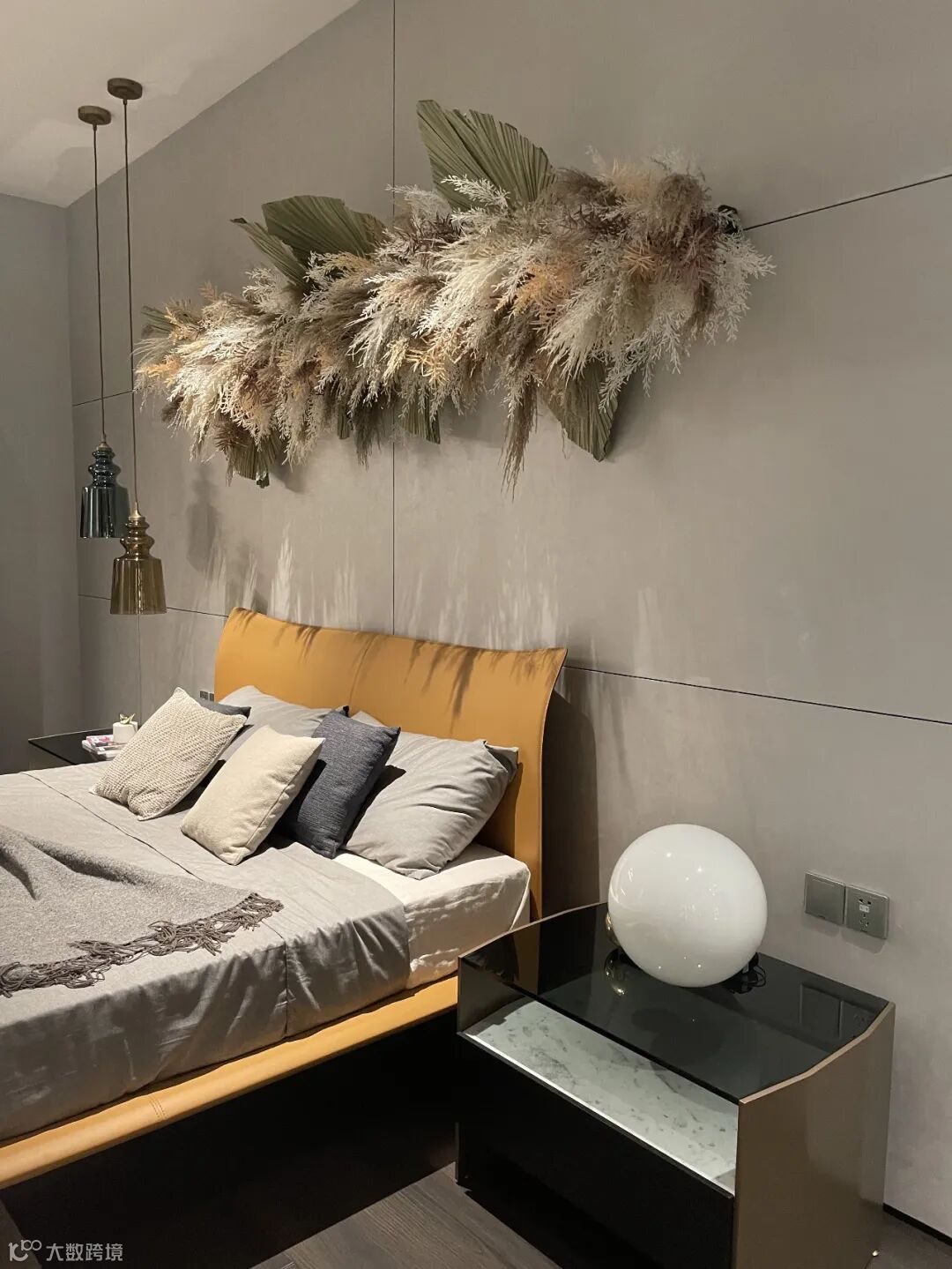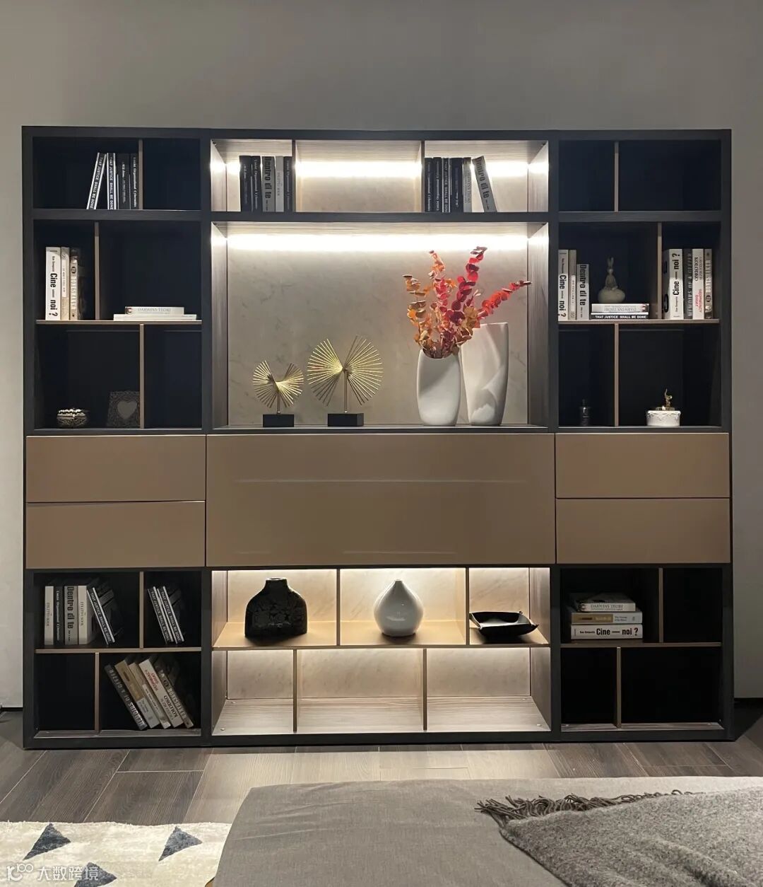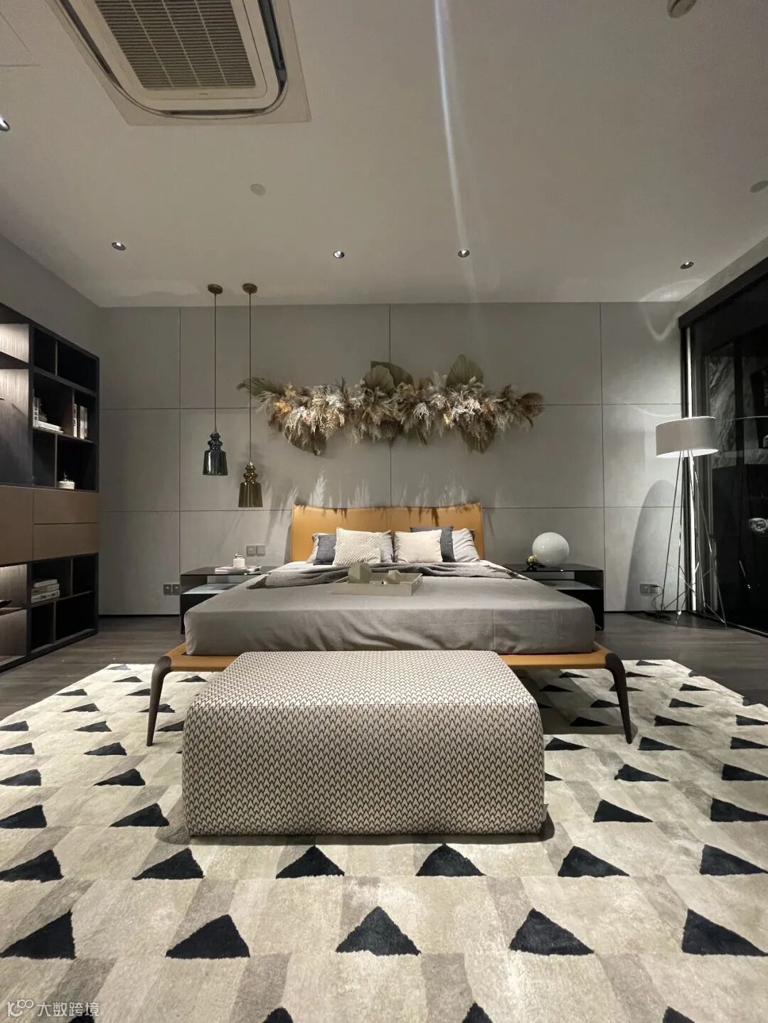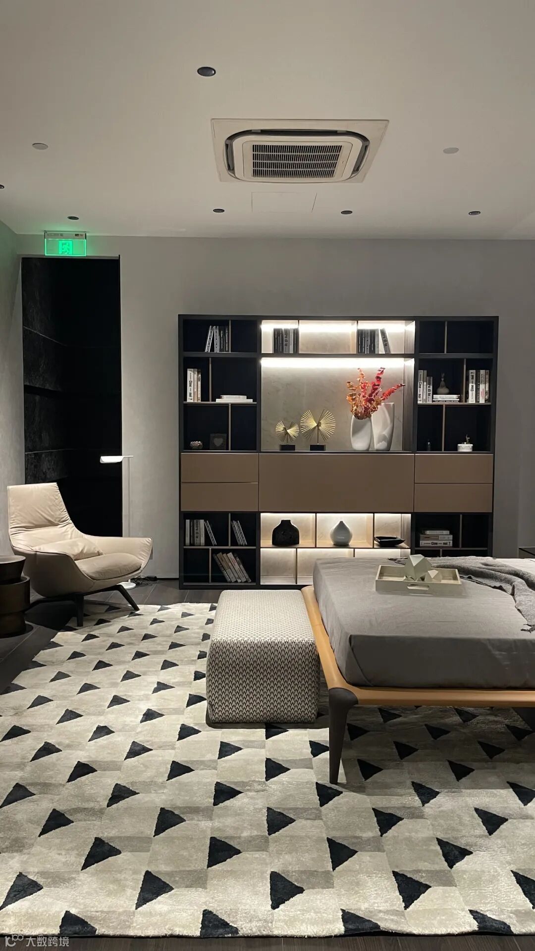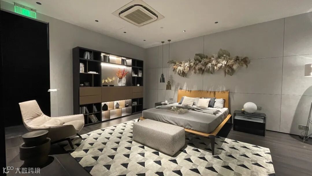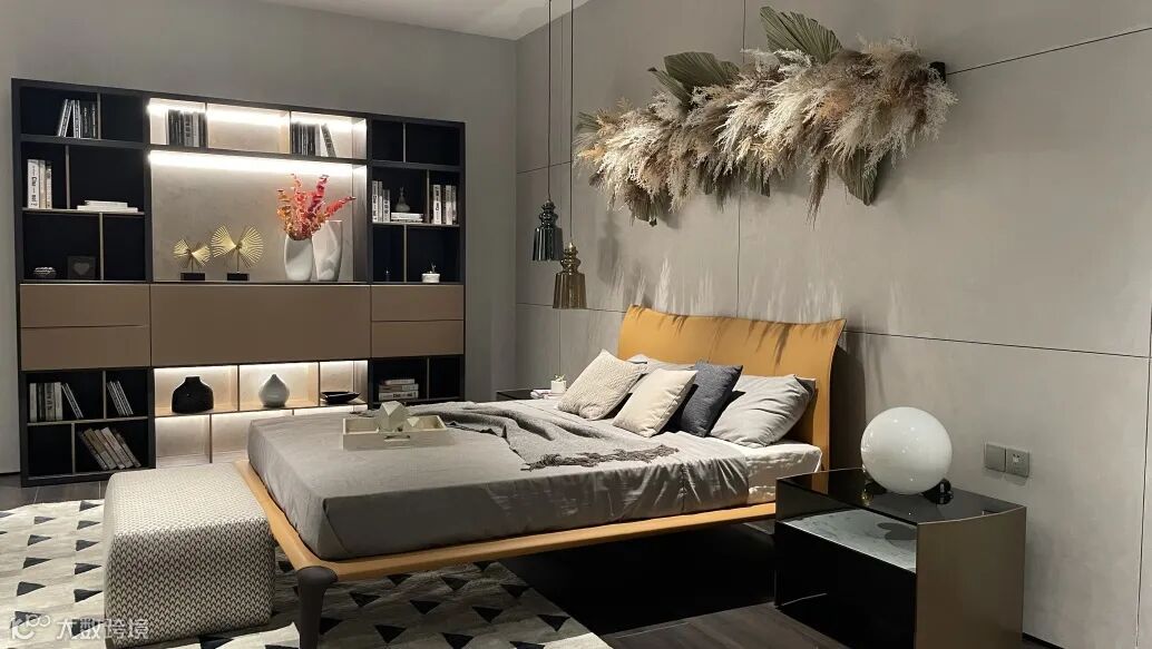 床侧设计了一个Crossing独立书架,满足多方位的存储及装饰需求,视觉上给予含蓄奢华、错落有致的丰富观感,增加了空间的奢华气度。