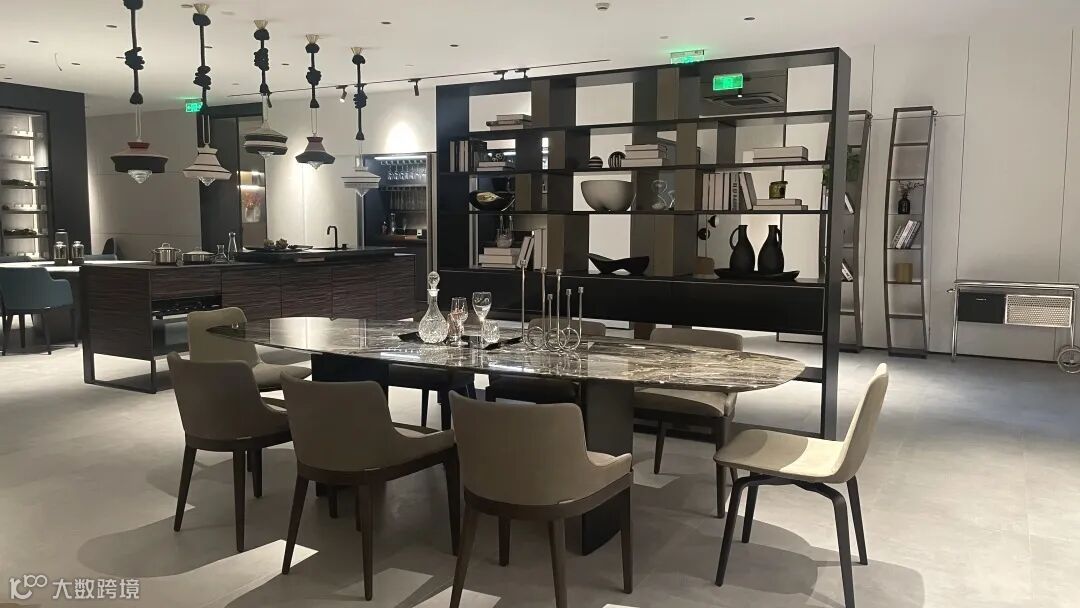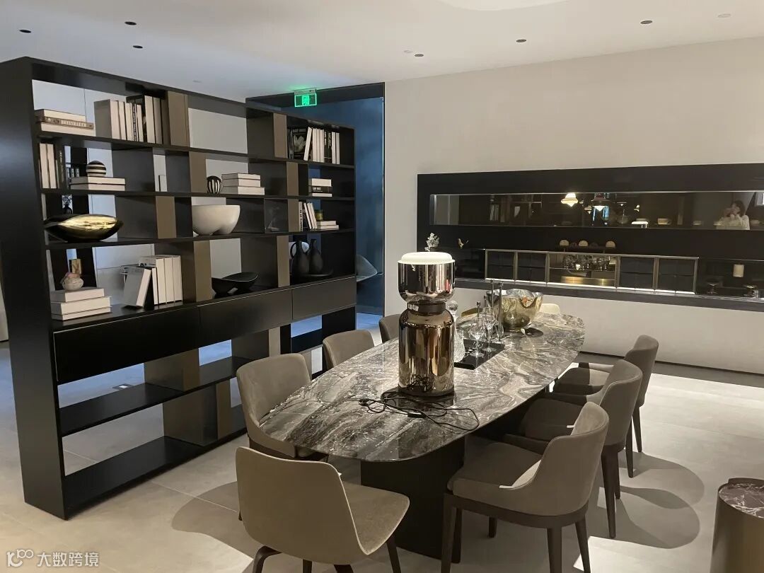展厅进门左转,首先来到的是餐厅区域。空间大面积使用黑灰色打底,用Urban书柜作为区域隔断,叠加多样化的层次感。配以Ala系列大理石长餐桌增强局部线条,展现时尚而精致的用餐氛围。