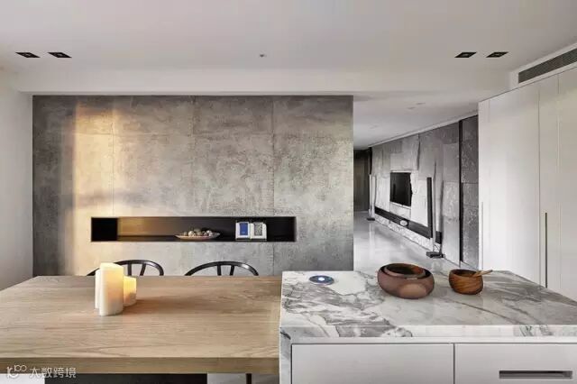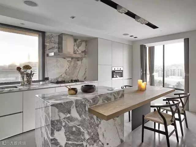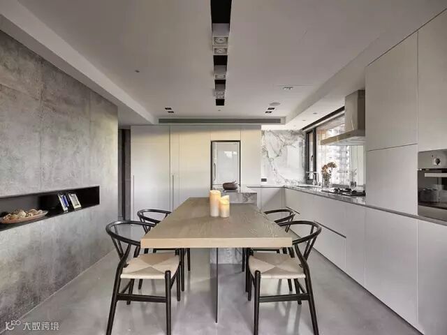 厨区空间乍看一片纯白,其实是以浅灰色作为背景,令吧檯、牆体的石材纹理彷若一幅生动的水墨画卷,在淡雅背景裡柔和延伸。