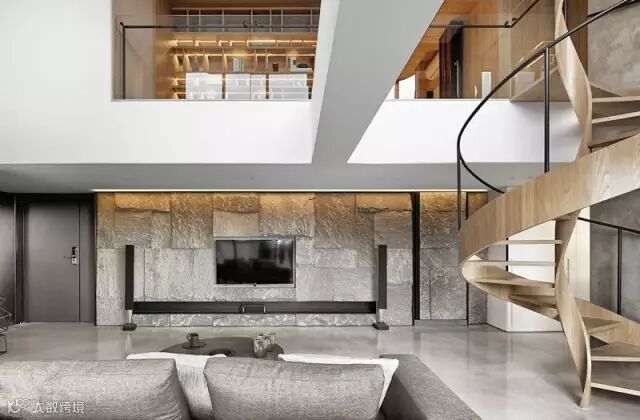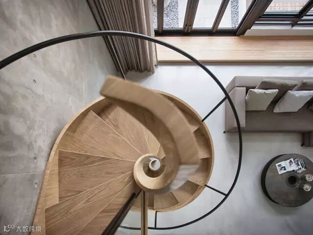 线条亦为空间带入一抹舞动之姿,连接两座楼层的迴旋梯以柔曲弧线向上翻扬,打破满室静默氛围,随著居住者行走其间的身影动态,一再创造新画面。