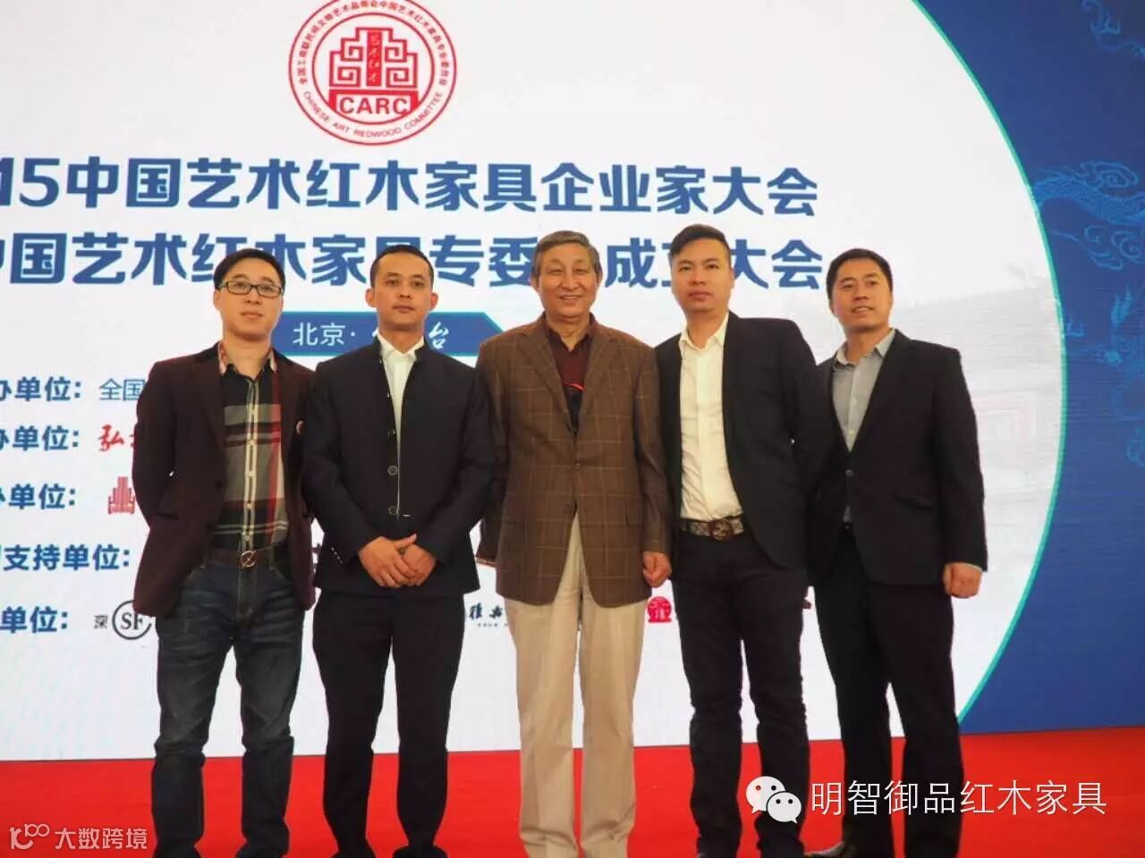 明智御品当选为中国艺术红木家具专委会常务委员单位,董事长林毅昭(右二)上台领取牌匾
