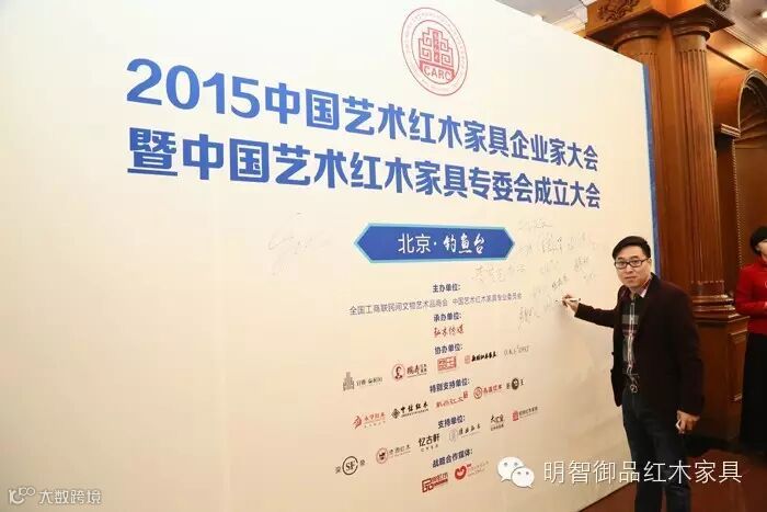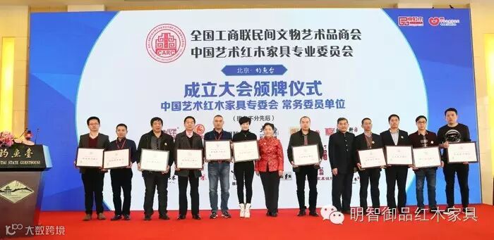 11月23日,首都北京初雪降临,严寒也没有阻挡住红木人共襄盛举的步伐。由全国工商联民间文物艺术品商会和弘木传媒牵头发起的“全国工商联民间文物艺术品商会中国艺术红木家具专业委员会”(以下简称中国艺术红木家具专委会)成立大会在北京钓鱼台国宾馆隆重举行。中山市明智御品家具有限公司(以下简称明智御品)在全国工商联及政府部门领导,红木行业专家学者、各大产区主流企业家的共同见证下,当选为中国艺术红木家具专委会常务委员单位,董事长林毅昭上台领取牌匾。