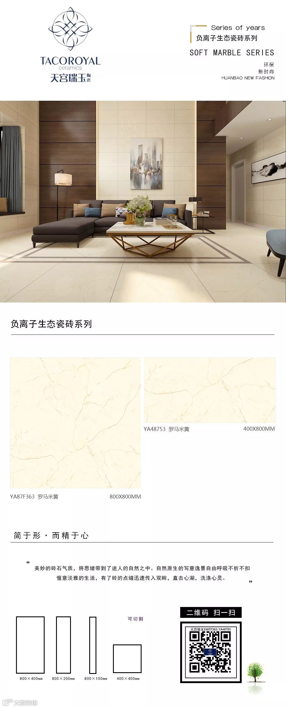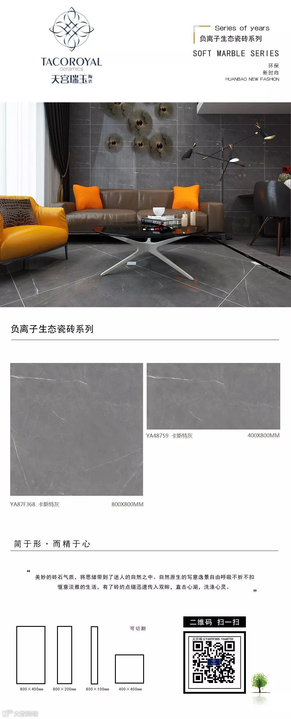 天瑞陶瓷,网红热卖400*800中板+800*800生态负离子通体大理石瓷砖,相同花色,相同色系子母砖,给你搭配出同色系的现代简约轻奢豪宅。整体化的视觉给人一种舒适和温馨。让你的家装多一重选择,让整个空间更加的简约舒适,空间装饰效果整体划一,彰显大气。