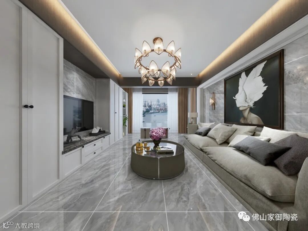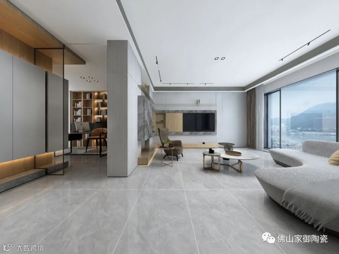 【麦迪逊灰】经连纹铺贴作为背景墙应用,与大岩板一样能展现大气、充满力量感的视觉效果。墙地通用,在空间形成巧妙的呼应,让家居塑造出一种统一的和谐之美。