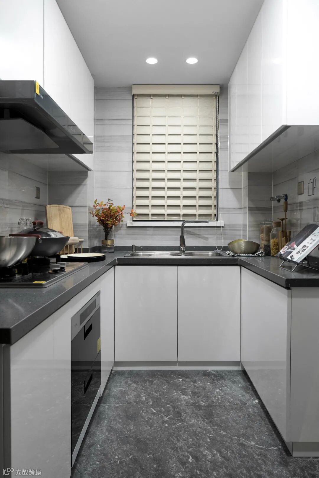 ▲厨房在深灰色地砖的空间基础,厨房操作台也是以灰色的材质,结合白色橱柜与吊柜,窗户装着百叶帘,现代优雅的空间感,让做饭炒菜也有一个舒适轻松的体验。