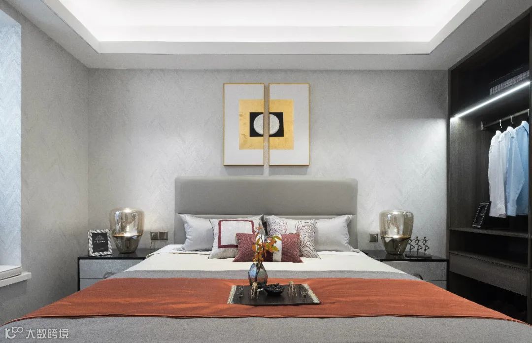 ▲卧室墙面贴上灰色墙布,床头墙的两幅长条装饰画拼一起后,形成一个正方形的图案,两侧对称的床头柜上也是布置一样款式的台灯,整体空间和谐而统一大方。
