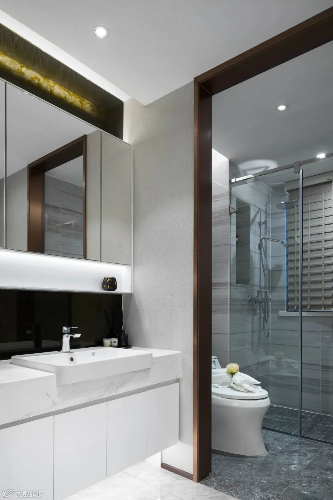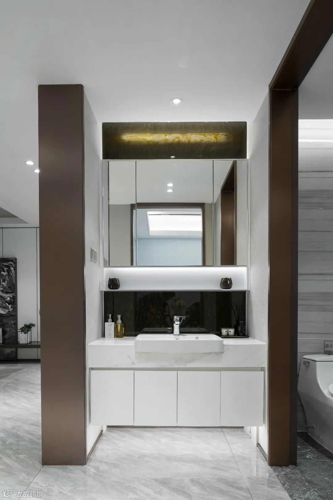 ▲卫生间的洗手盆外置在过道区域,门框门洞加入不锈钢的材质,嵌入安装的洗手盆以雅白色的台上盆款式,装饰上一个大尺寸的镜柜,镜柜底部加入灯带,让空间显得明亮而现代时尚。