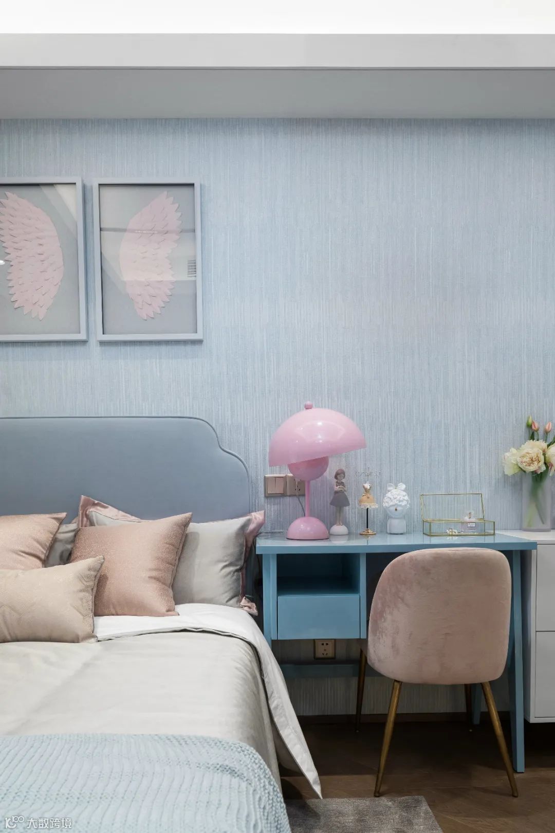 ▲暗粉色的凳子,搭配蓝色的小书桌,桌面上可爱的小摆件、精致的花瓶,也营造出一种温情优雅而端庄的空间氛围。