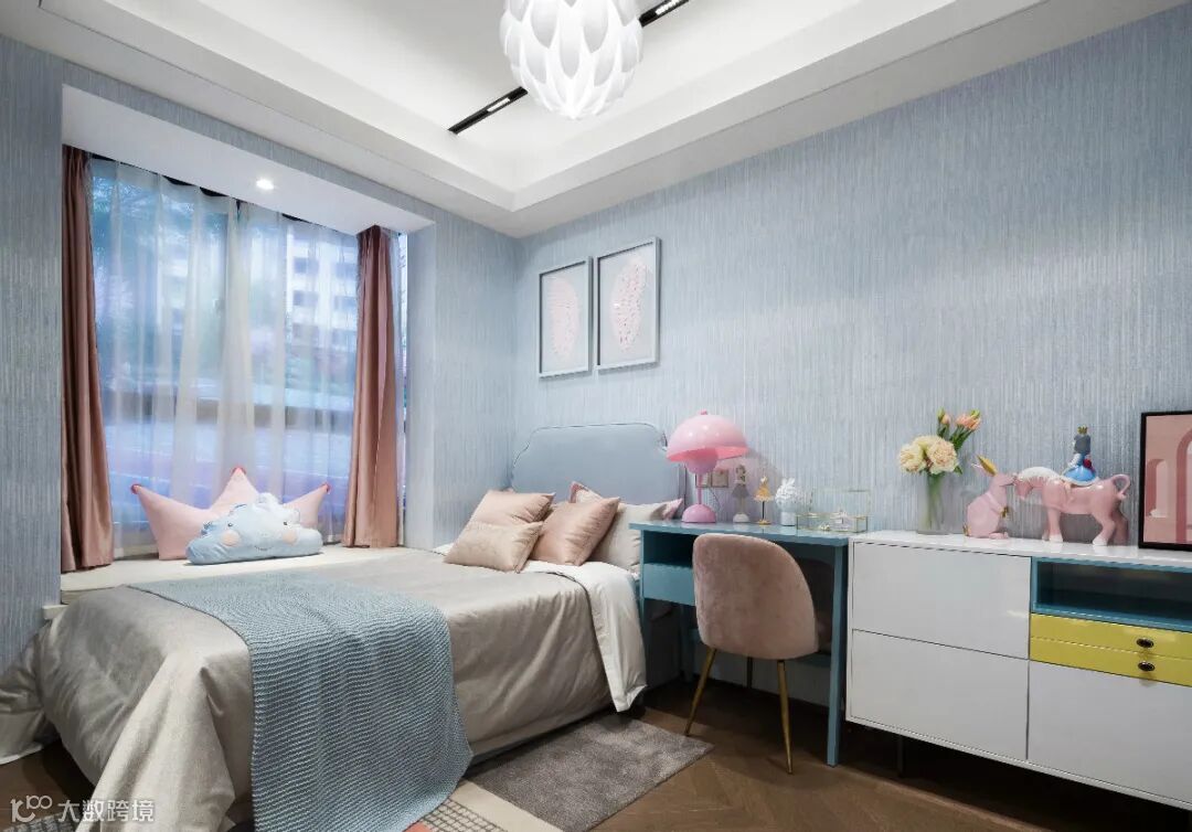 ▲儿童房的墙面贴上蓝色带浅竖纹的墙布基础,靠飘窗布置床铺,右侧是书桌+矮柜的组合,布置粉色抱枕枕头与小摆件,也让空间显得更加缤纷优雅而浪漫。