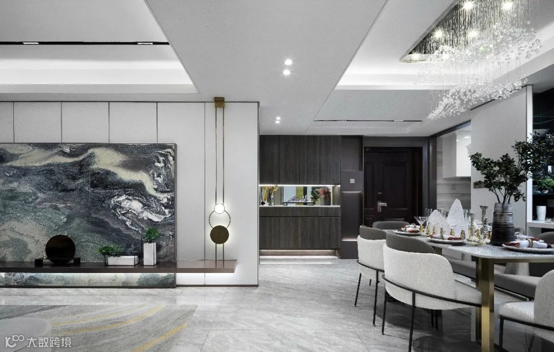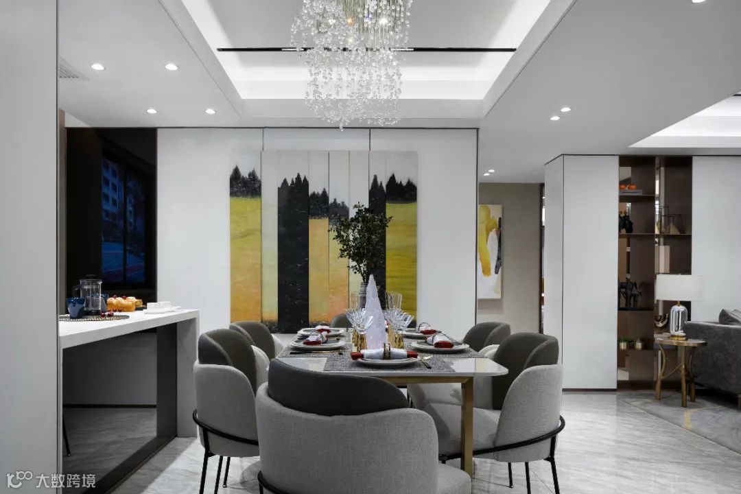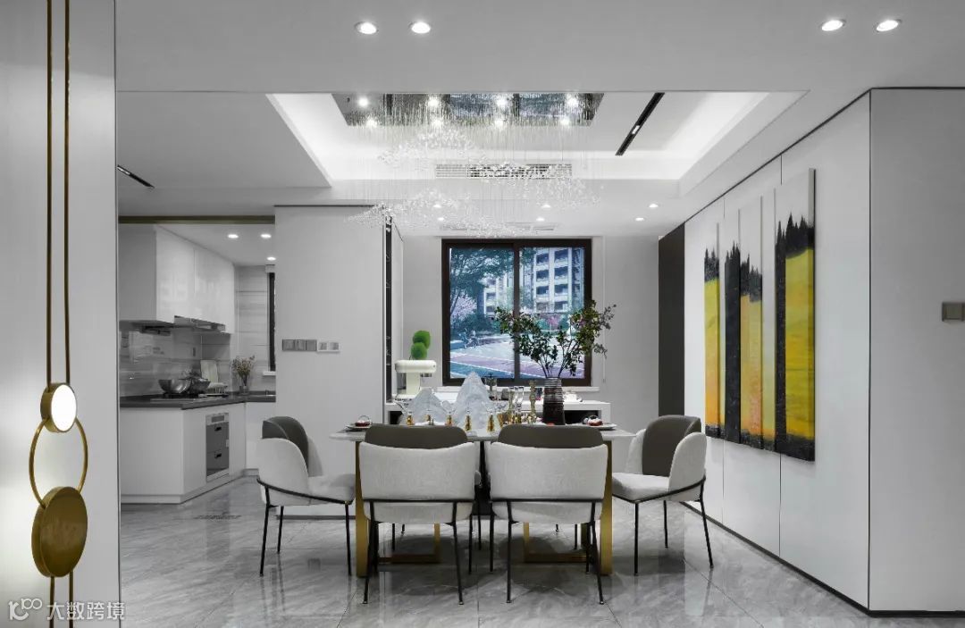 ▲餐厅空间现代简洁的硬装空间,天花装上一盏华贵的水晶吊灯,布置六人位的餐桌椅组合,满足了家人用餐的舒适需求。