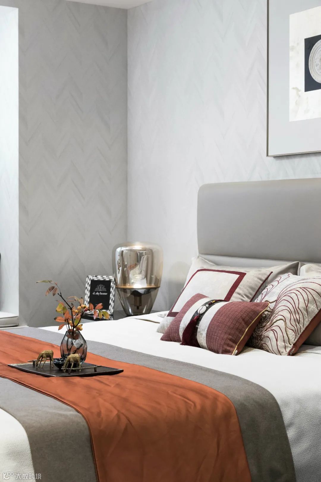 ▲主卧空间以灰色的墙面空间基础,床头墙与左侧都是黑色的,而右侧床头墙这是以灰色硬包背景墙,布置棕色皮艺床,橙白配的床单与朴素的地毯,也让空间显得更加温情优雅而自然。