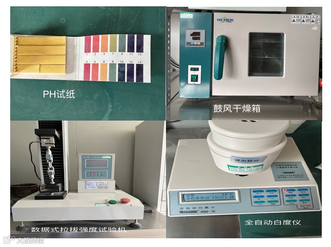 以下是质检人员检测常用到工具:PH试纸用于测试粉料的酸碱值,鼓风干燥箱用于测试板白、锈点烘干以及成品的耐高温测试等,数据式拉拔强度试验机用于产品在设定规定的情况下进行拉拔强度测试,全自动白度仪用于测试碳酸钙粉的粉白、板白和成品粉白白度。