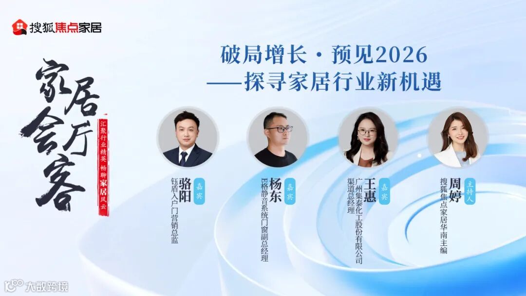 8月26日,由搜狐焦点家居主办的《家居会客厅》——“破局增长・预见2026——探寻家居行业新机遇”为主题的线下沙龙在广州搜狐媒体中心举行。广州集泰化工股份有限公司渠道总经理王惠、E格静音系统门窗副总经理杨东、钰盾入户门营销总监骆阳受邀出席,深入分享企业在应对行业困局、把握市场新机、布局2026年发展等方面的具体策略和独到见解。
