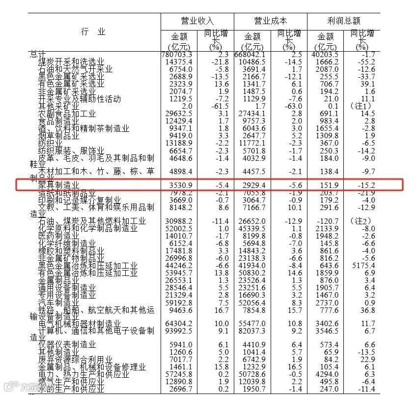 国家统计局8月27日发布2025年1-7月全国规模以上工业企业利润数据报告。数据显示,全国规模以上家具制造企业营业收入3530.9亿元,同比下降5.45%;营业成本2929.4亿元,同比下降5.6%;利润总额151.9亿元,同比下降15.2%。
