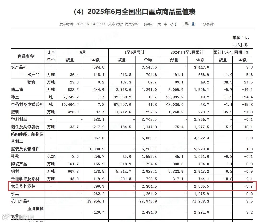 全国出口重点商品量值方面,家具及其零件1-6月出口总值为2364.5亿元人民币,比去年同期下降5.7%,其中6月单月出口总值为399.9亿元人民币。