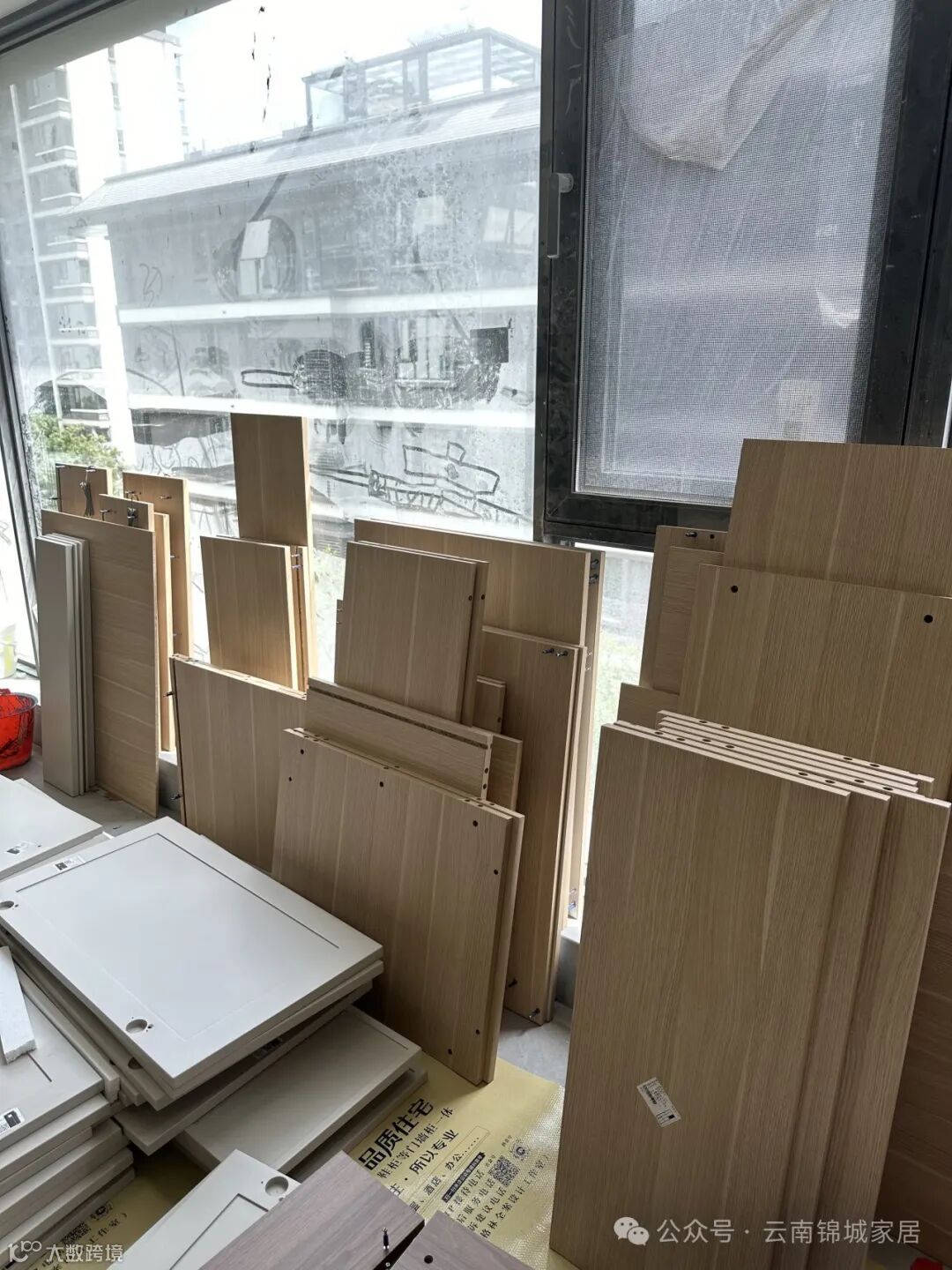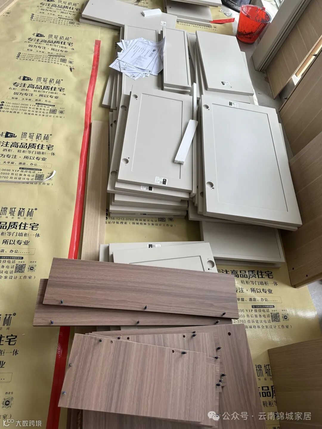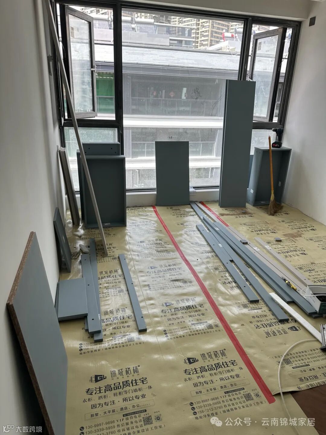 货物在安装现场被有序地摆放,确保了环境的整洁和作业的高效。柜体、柜门以及五金配件等均按照类别进行了明确的分区存放。