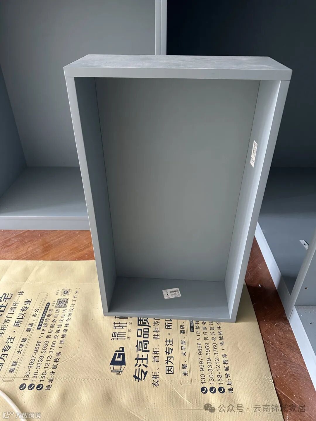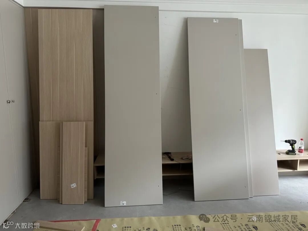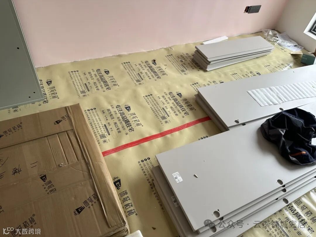 货物在安装现场被有序地摆放,确保了环境的整洁和作业的高效。柜体、柜门以及五金配件等均按照类别进行了明确的分区存放。