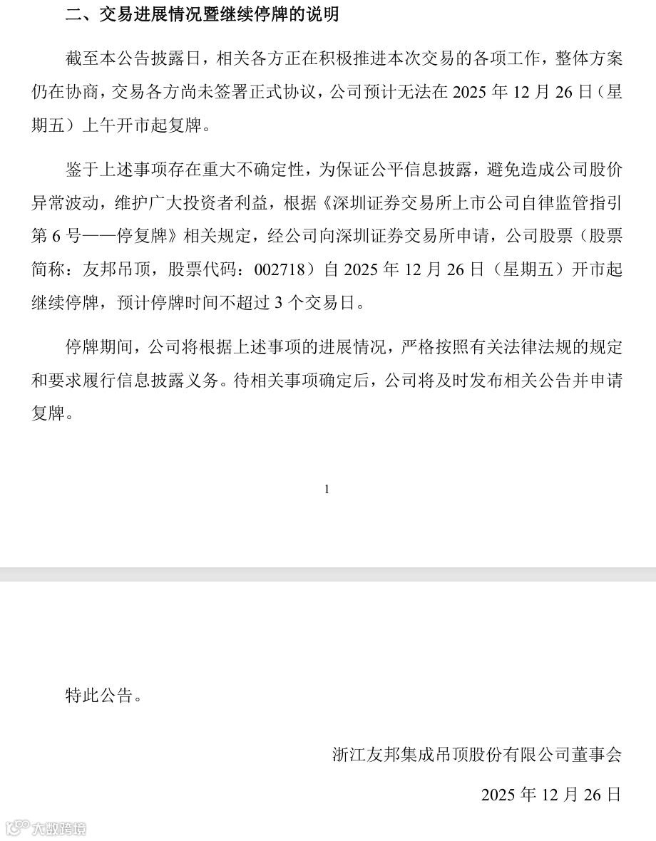 12月25日晚间,友邦吊顶(002718)发布公告,截至公告披露日,公司实际控制人骆莲琴、时沈祥正在筹划有关公司控制权变更事宜,可能导致公司控股股东、实际控制人发生变更。由于相关各方正在积极推进交易的各项工作,整体方案仍在协商,预计无法在2025年12月26日上午开市起复牌。为保证公平信息披露,避免造成公司股价异常波动,公司股票自2025年12月26日开市起继续停牌,预计停牌时间不超过3个交易日。