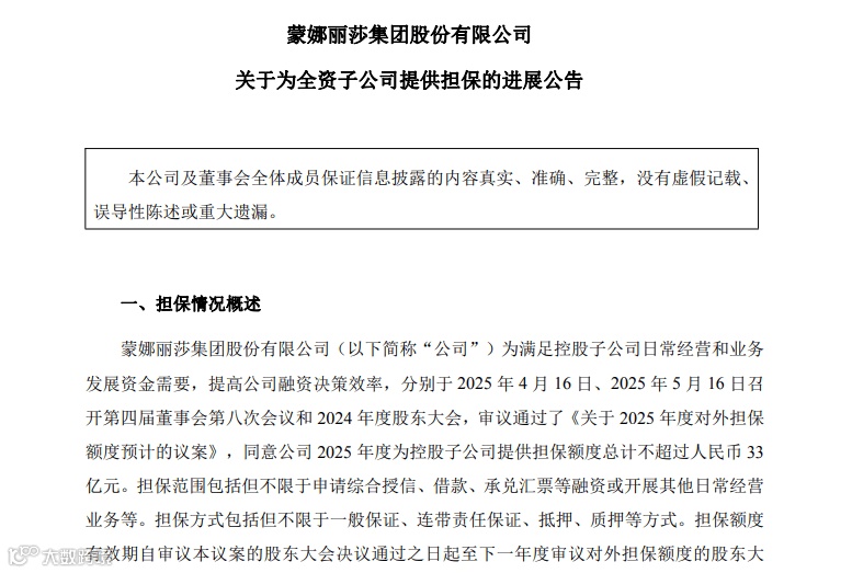 蒙娜丽莎集团为全资子公司提供