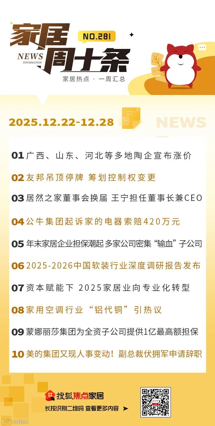 临近年末,家居上市公司为子公司提供担保的公告密集发布。仅12月以来,已有顾家家居、箭牌家居、欧派家居、蒙娜丽莎、尚品宅配等五家行业知名企业先后披露相关担保进展或计划,涉及担保额度累计已超百亿元,反映出行业在岁末资金需求旺盛,母公司通过担保方式支持子公司业务发展的常态化趋势。