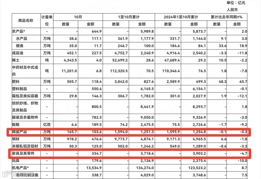 前10个月,我国家具及其零件累计出口额为3718.6亿元,同比下降4.7%,家居建材出口整体面临一定挑战。陶瓷产品出口额达1251.3亿元,同比微降0.3%;灯具、照明装置及零件出口额为2194.7亿元,同比下降9.7%。