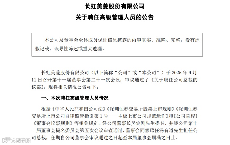 9月12日,长虹美菱聘任新总裁