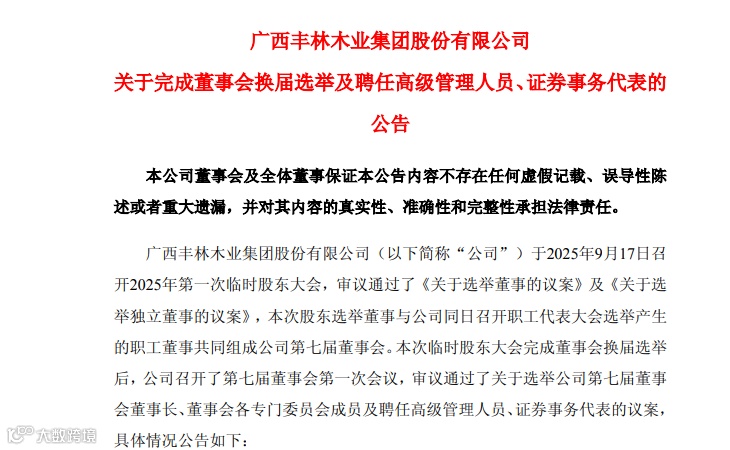 9月17日,丰林集团完成董事会换届