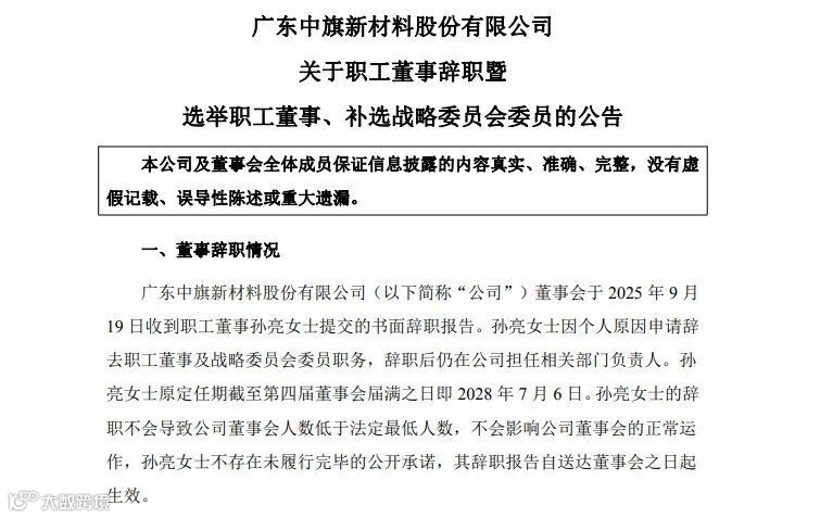 9月20日,中旗新材职工董事孙亮离职