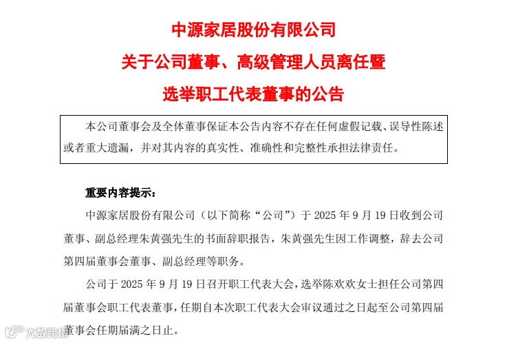中源家居股份有限公司发布公告,公司董事、副总经理朱黄强因工作调整原因辞去公司董事、副总经理及董事会专门委员会委员职务,辞职后不再担任公司任何职务。此外,选举陈欢欢女士担任公司第四届董事会职工代表董事。