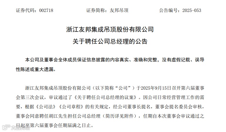 浙江友邦集成吊顶股份有限公司召开第六届董事会第三次会议,审议通过了《关于聘任公司总经理的议案》,经董事长提名,董事会同意聘任由副总经理胡江先生担任公司总经理。