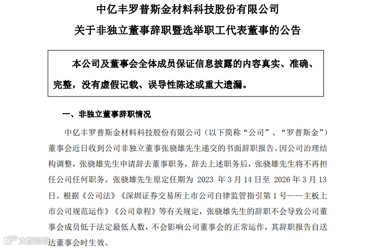 中亿丰罗普斯金材料科技股份有限公司发布公告,公司非独立董事张骁雄因公司治理结构调整申请辞去董事职务。此后,公司职工代表大会选举俞军先生担任职工代表董事。
