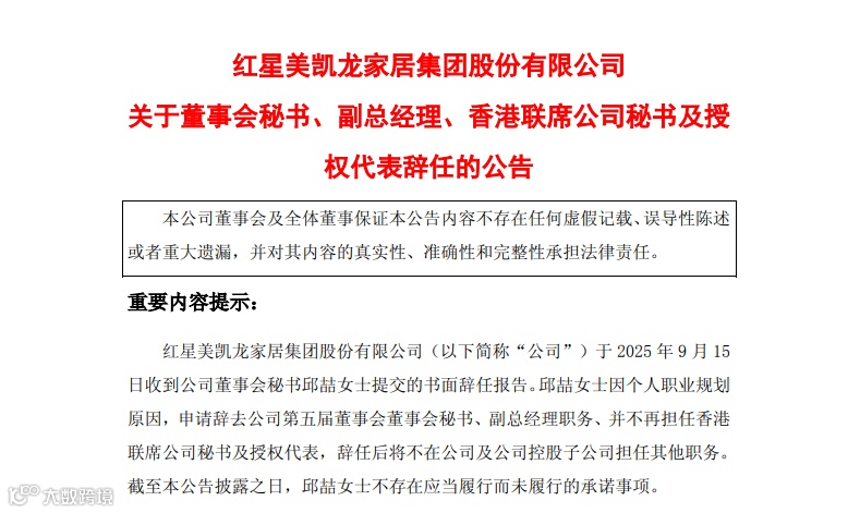9月15日,红星美凯龙董事会秘书辞职