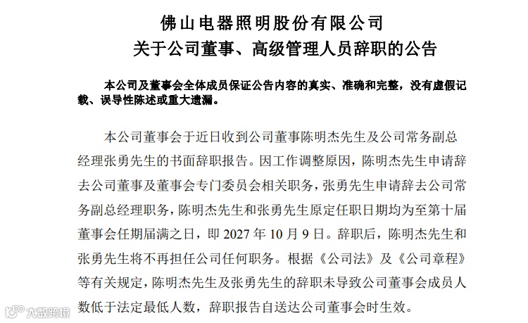 佛山电器照明股份有限公司公告,公司董事陈明杰先生因工作调整辞去董事及董事会专门委员会委员职务;常务副总经理张勇先生也因工作调整辞去相应职务。同时,董事会同意聘任李泽华先生为公司副总经理。
