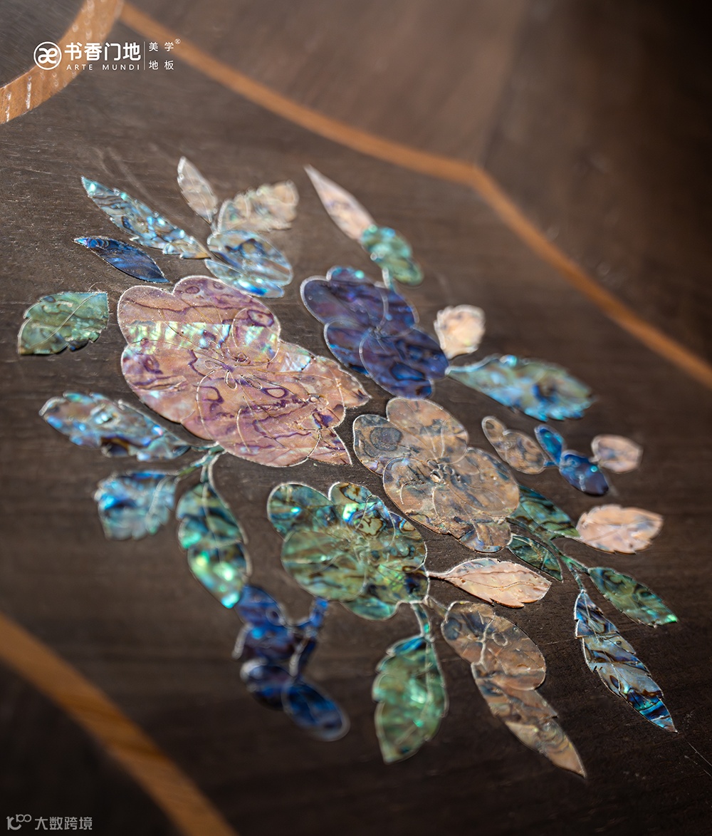 百卉含英则融合了拥有悠长历史的螺钿工艺,是名贵家具标志与木相融,其色彩似梦幻极光,质感如丝绸拂面,绘就木地板的视觉效果及艺术性。