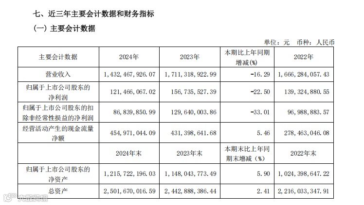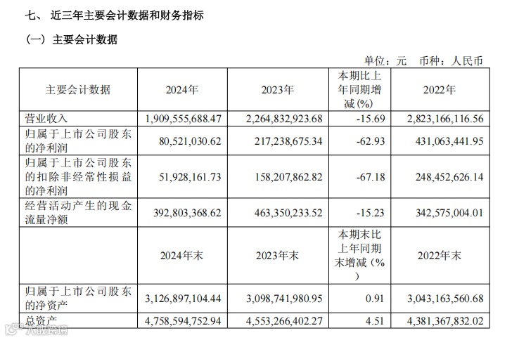 好莱客2024年营收19.1亿元,同比下降15.69%,净利润8052.1万元,同比下降62.93%。大宗业务收入下降叠加毛利率下滑,导致利润大幅缩水。