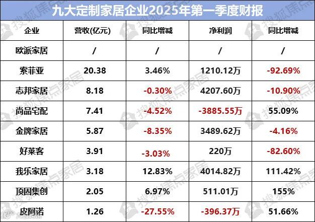 2025年一季度,定制家居企业业绩分化延续,我乐家居、顶固集创通过成本控制与业务优化实现逆势增长;索菲亚、志邦等头部企业营收承压但战略调整持续推进;尚品宅配、皮阿诺亏损收窄但仍未脱困;好莱客净利暴跌反映工程渠道风险。行业复苏仍需依赖需求回暖与战略执行效率。