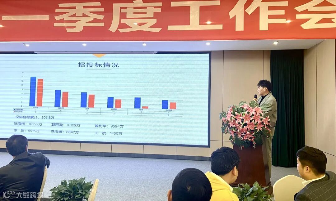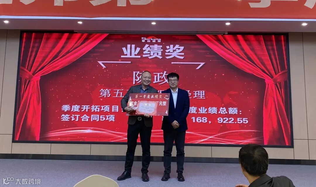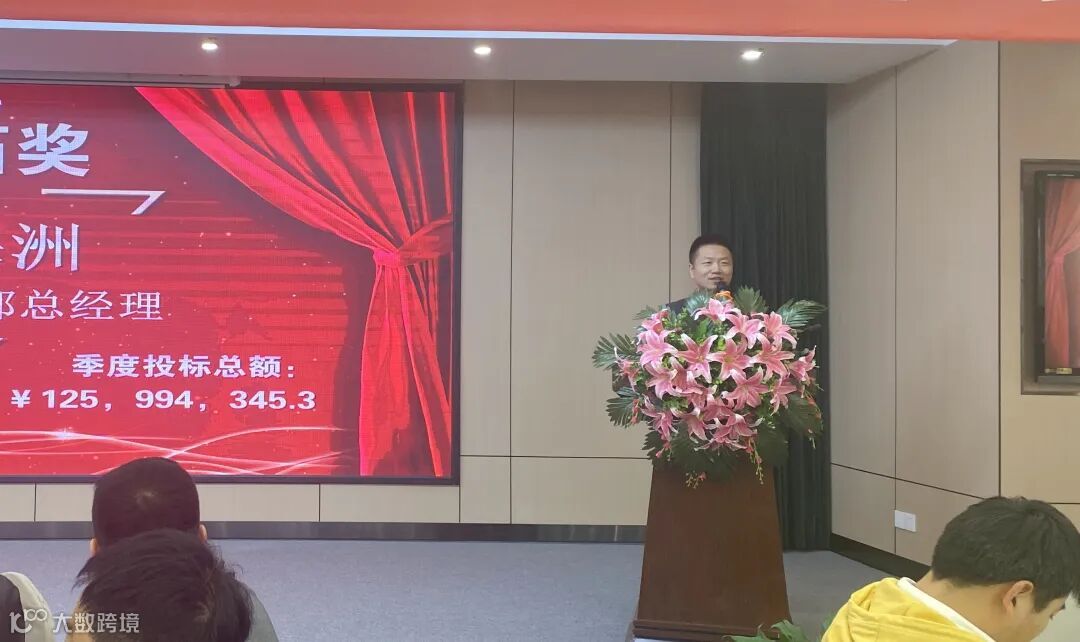 明确了第一季度的业绩数据后,宋总为开拓甲方数量第一的团队领导——陈海洲陈总颁发了开拓奖。第一季度中,陈总参与投标14项,金额达到1.2个亿,获得开拓奖正所谓实至名归。