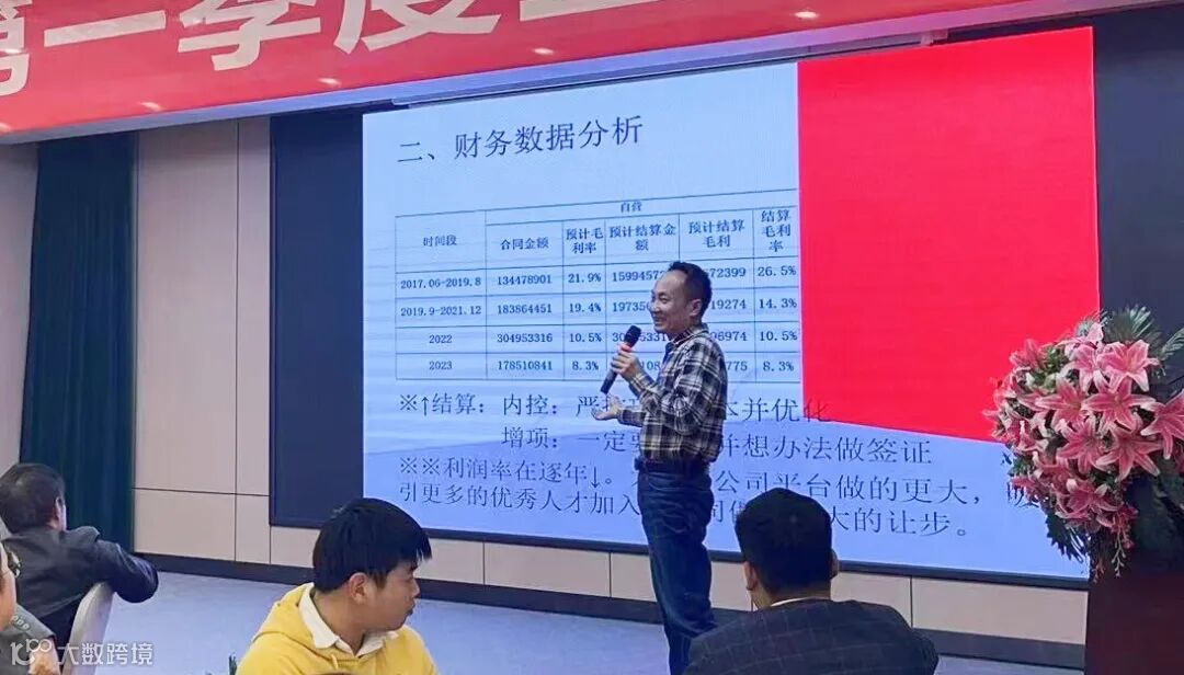 颁发完优秀员工奖,成本合约部李凯迪李总作第一季度工作报告,针对公司一季度工作,他的报告给出了详细的数据并再次明确了中鑫盛邦2023的业绩目标——“实现营收8个亿”。