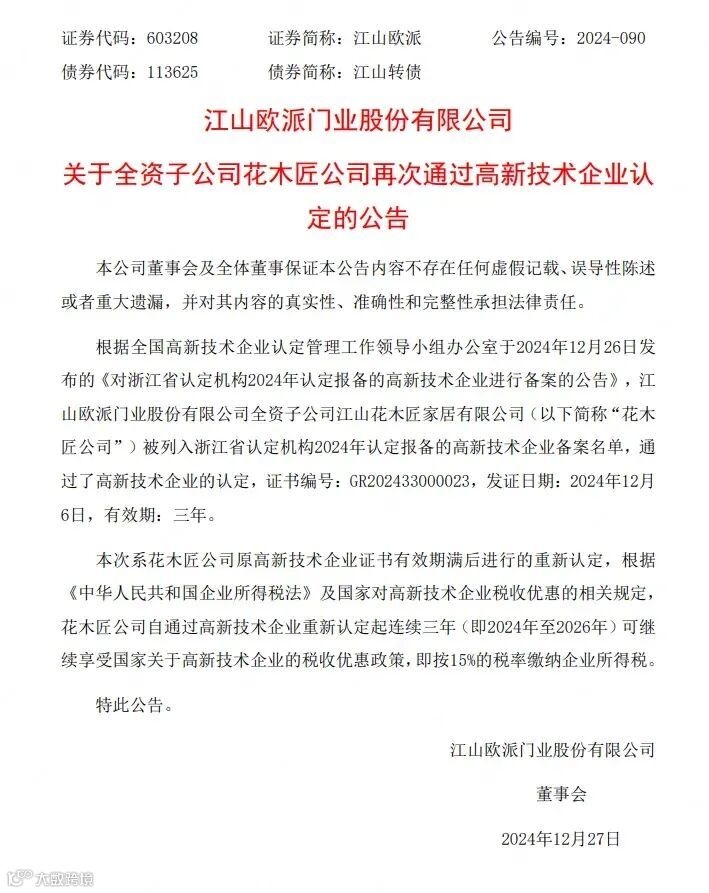 12月26日,高企认定官网披露对上海市认定机构2024年认定报备的第一批高新技术企业进行备案的公告,左尚明舍家居用品(上海)有限公司在列,证书编号GR202431000998,发证日期为2024年12月26日。