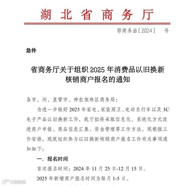 根据湖北发布的《关于组织2025年消费品以旧换新核销商户报名的通知》显示,家电厨卫、家居家装销售企业可报名。2025年新增商户的报名时间则定为每月的1日至5日。对于2024年度已经参加并获得资格的商家,2025年还需要重新报名申请。