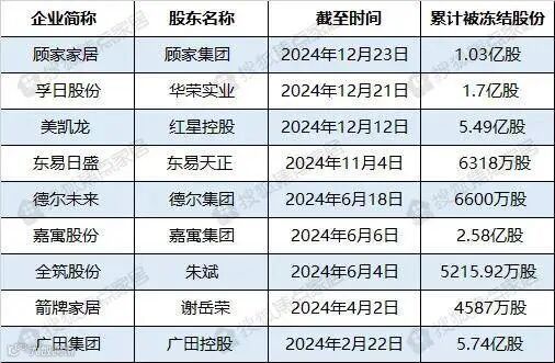 2024年以来,据搜狐焦点家居不完全统计,包括顾家家居、孚日股份、美凯龙、东易日盛、德尔未来、*ST嘉寓、全筑股份、箭牌家居、广田集团等在内,九家上市家居企业股东股份被司法冻结。