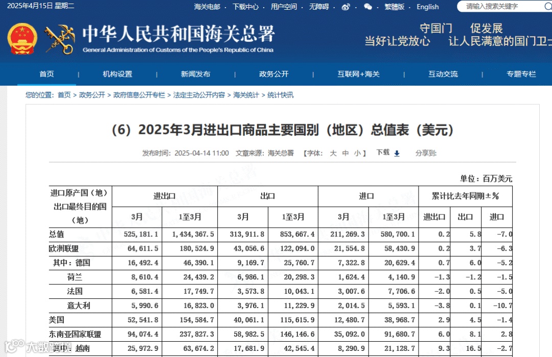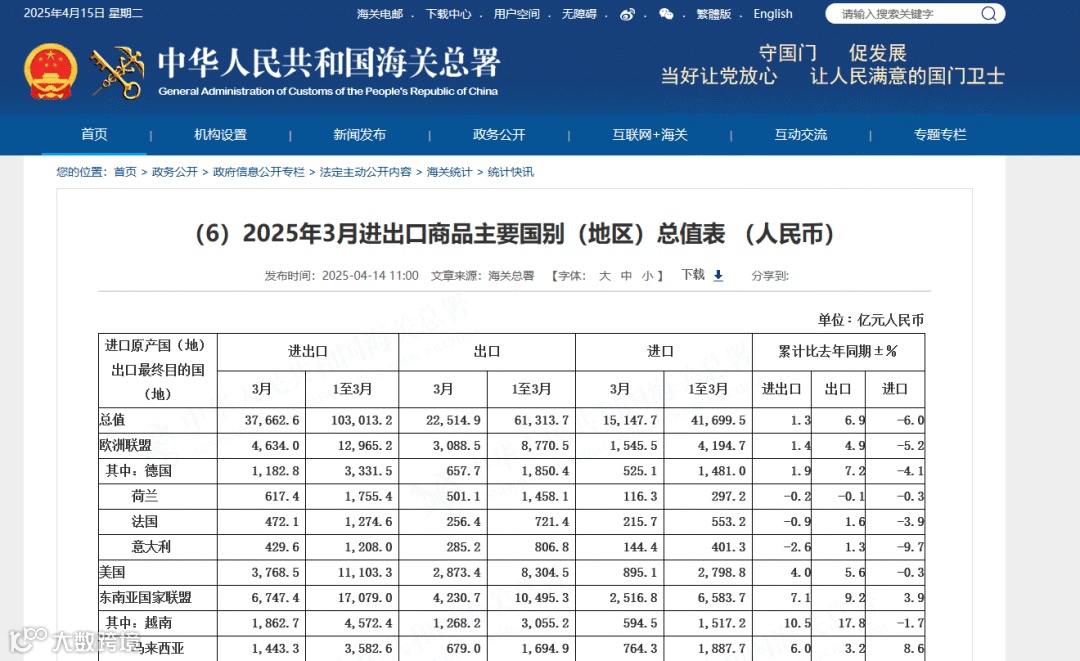 以人民币计,1-3月,进出口总值103013.2亿元,同比增长1.3%。1-3月,出口总值61313.7亿元,同比增长6.9%;其中,3月同比增长13.5%。1-3月,进口总值41699.5亿元,同比下降6.0%;其中,3月同比下降3.5%。