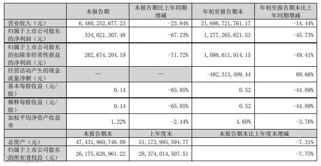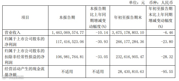 东方雨虹发布2024年第三季度报告称,今年前三季度实现营业收入约216.99亿元,同比下降14.44%;归属于上市公司股东的净利润约12.77亿元,同比下降45.73%。