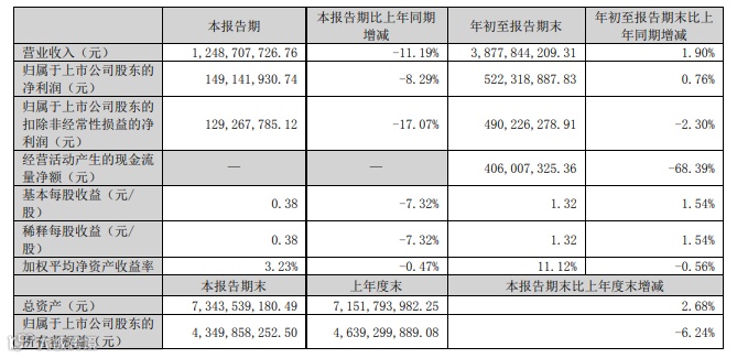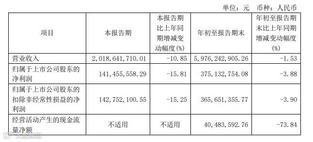 喜临门发布2024年三季报。报告显示,公司前三季度营业收入为59.76亿元,同比下降1.53%;归母净利润为3.75亿元,同比下降3.88%;扣非归母净利润为3.66亿元,同比下降3.90%;基本每股收益0.99元。