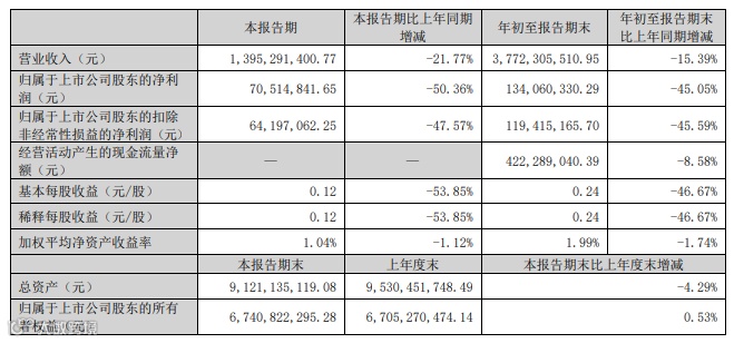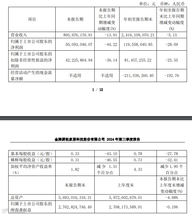 根据金牌家居公告,公司第三季度营收为8.96亿元,同比下降13.91%;净利润为5009.3万元,同比下降44.22%。前三季度营收为24.16亿元,同比下降5.15%;净利润为1.2亿元,同比下降28.09%。