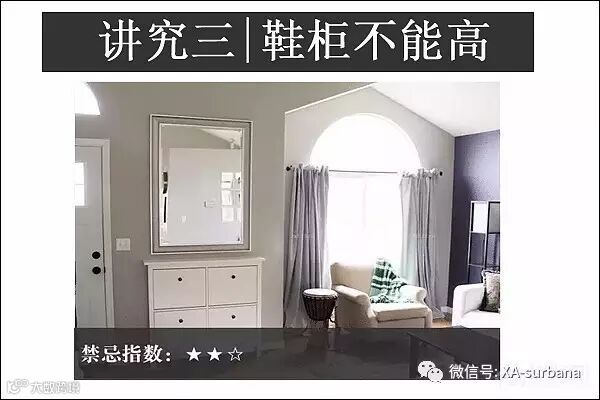 客厅和玄关一般都是一个整体,在门口玄关处一般的家庭都会设立换鞋处和鞋柜,阻挡脏污进入室内,在门口旁的鞋柜的高度上以不高于成人臀部为佳,在门口换鞋是因为每天穿的鞋子多多少少会沾尘沙或者泥土之类,这类代表秽气,会影响到个人运势。