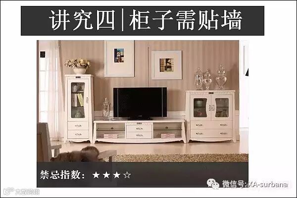 客厅的酒柜或橱子务必紧贴墙壁,另外沙发也必须面对大门或者电视,千万不可背门,因为沙发背门会让自己的人际关系不融洽,且易犯小人或与他人生口舌是非。另外一点原因是如果有盗贼闯入,才有较多反应的时间。