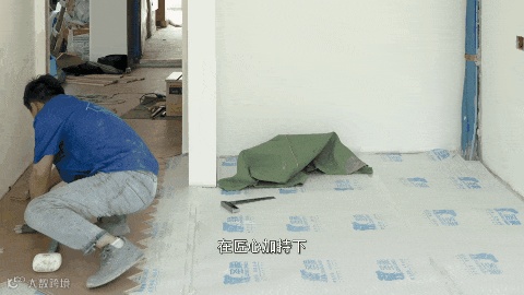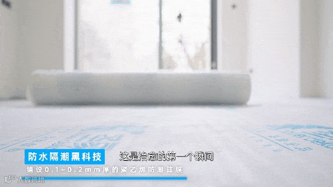 第一道工序,防水防潮黑科技上场——在经过前期的精准测量后,在地面铺设0.1-0.2mm厚的聚乙烯防潮薄膜,细致的施工,给未来新家筑牢第一道防线。